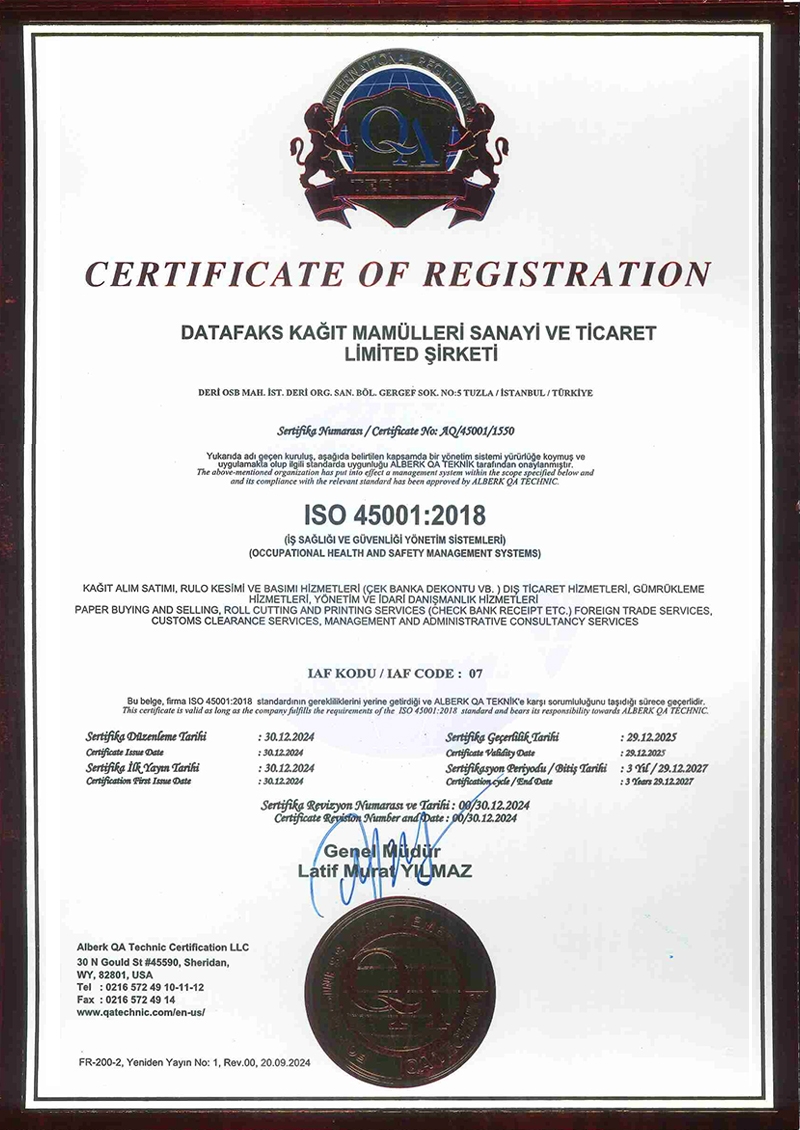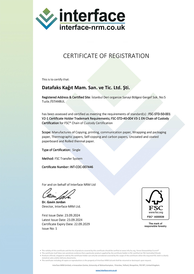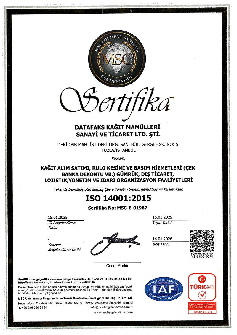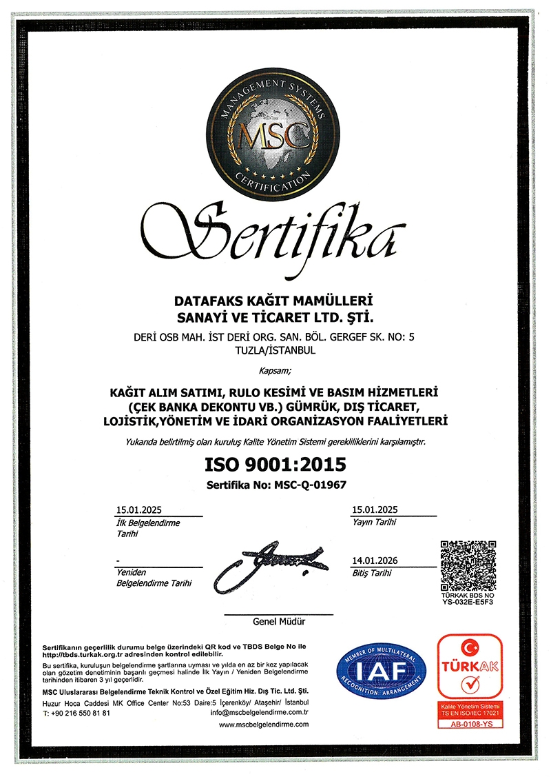 Datafaks, Türk Standardları Enstitüsü’nden (TSE) aldığı (TS 12440) Faksimile Kağıtları ve Yazar Kasa Ruloları Standardı Belgesi,